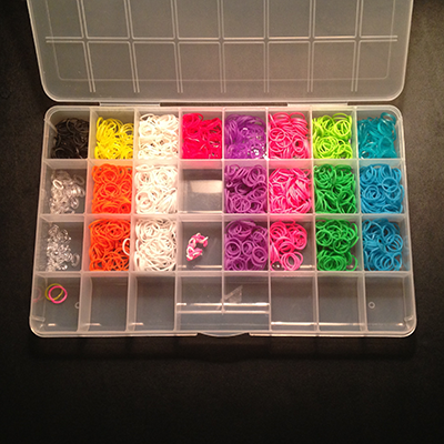 • You can find plastic cases to sort your rubber band into colored groups at craft stores like Michael’s or even at hardware stores or Target.  The small investment in one of these will be well worth it.